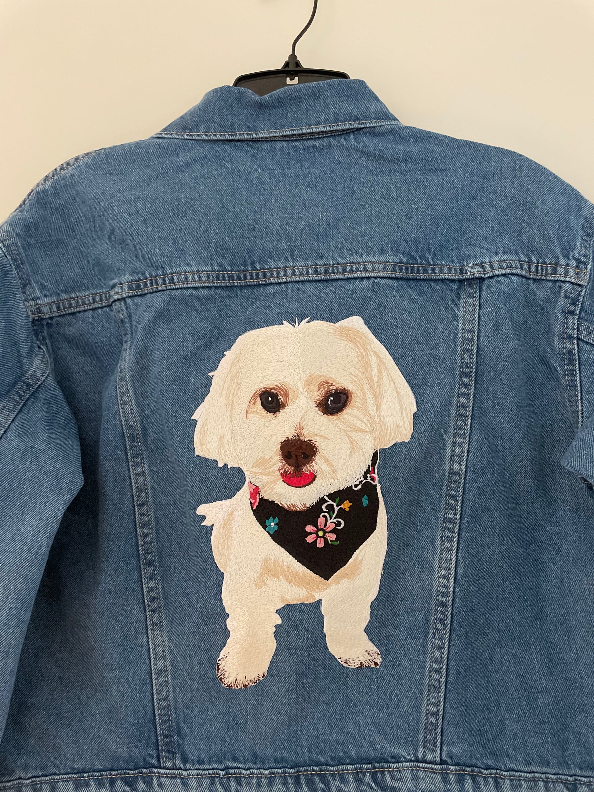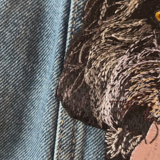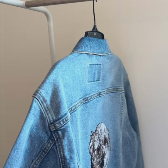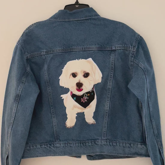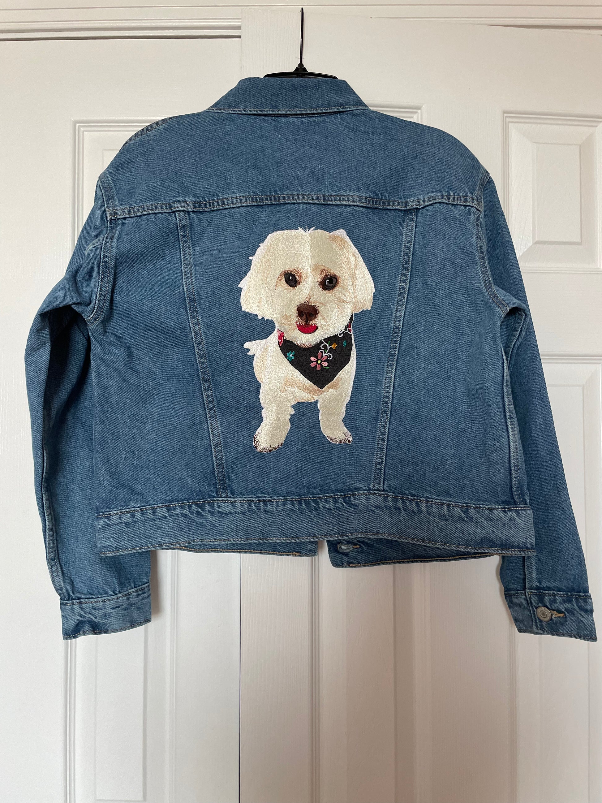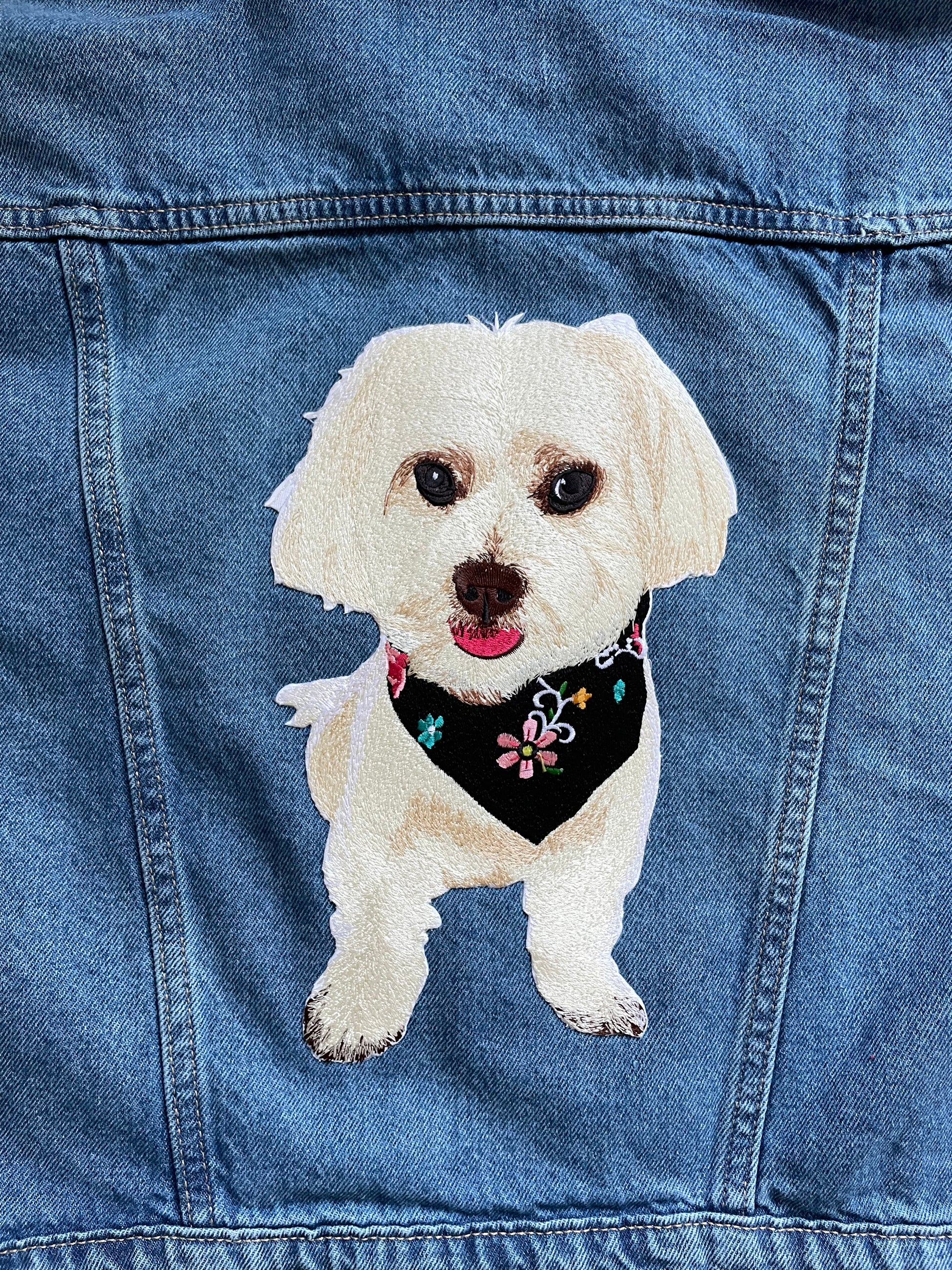 Upload a photo of your pet and we'll create a custom embroidered patch denim jacket just for you. Embroidered patch is placed on the back of the jacket by default. Standard size of patch is _x_ inches.